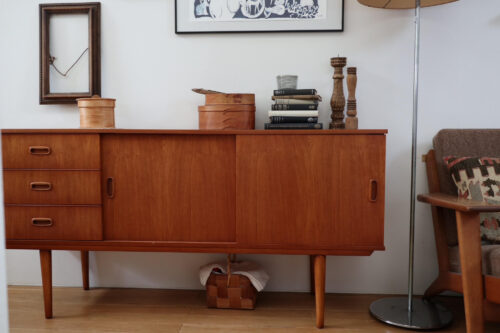 北欧ヴィンテージのサイドボードの上には、季節の枝物やお気に入りの古道具を並べています。